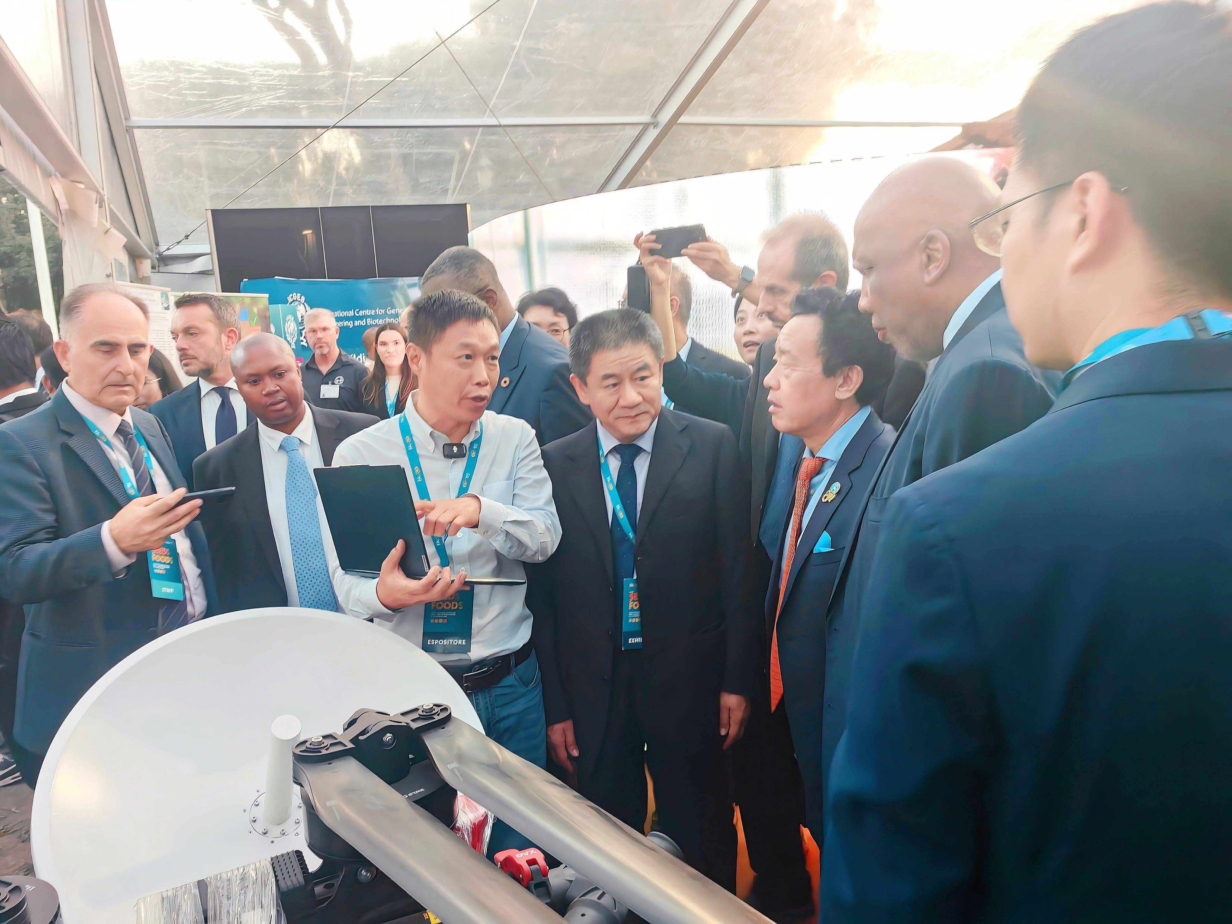 该技术可实时监测数千米高空迁飞昆虫的轨迹与行为,实现对草地贪夜蛾、稻飞虱等重大害虫的精准预警,推动虫害监测迈入“数字感知”新阶段。FAO总干事屈冬玉、副总干事Maurizio Martina 和莱索托国王亲临展台,听取了封洪强研究员关于该技术在我国田间地头的应用汇报,并对其在全球粮食安全中的积极作用表示认可。展会期间,来自美国、意大利、日内瓦、巴西、坦桑尼亚、赞比亚、印度尼西亚等数十个国家的农业部门官员、科研机构代表及企业负责人纷纷到访展台,就技术细节、数据共享及合作引进的可能性进行了深入交流。多国专家一致认为,此项技术对建立全球迁飞性害虫的跨境联合监测与早期预警网络具有重大意义。
